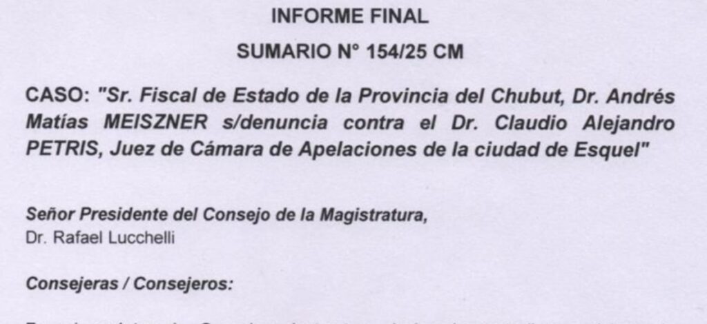La denuncia fue presentada por el Fiscal de Estado de Chubut, Andrés Meiszner, y detallada en el Informe final del sumario Nº 154/25, elevado el pasado lunes 6 de octubre. La gravedad de los cargos configura “circunstancias graves” según el artículo 25 de la Ley V Nº80, poniendo en entredicho la imparcialidad de la magistratura.