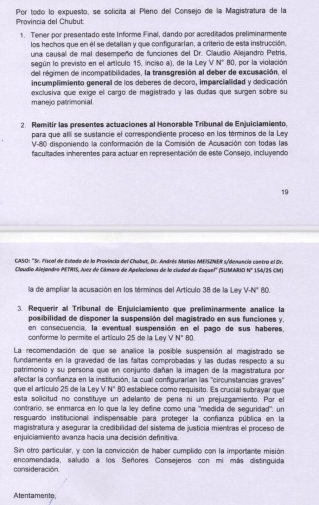 El dictamen acusa al Juez Petris de múltiples faltas que dañan la imagen de la magistratura y su persona, entre ellas: